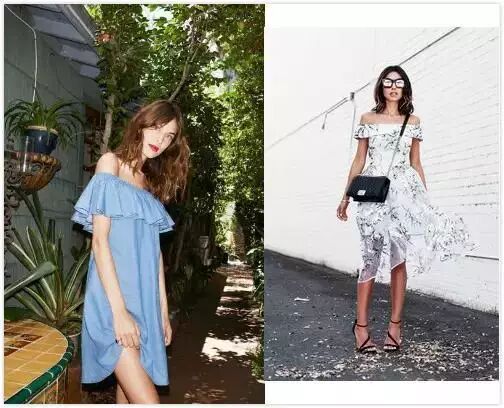 一字肩的优点是不仅可以收窄肩膀的视觉效果,同时可以瞬间让人focus你的性感锁骨,来一件一字肩款的连衣裙,简直是减龄神器,青春无敌。
