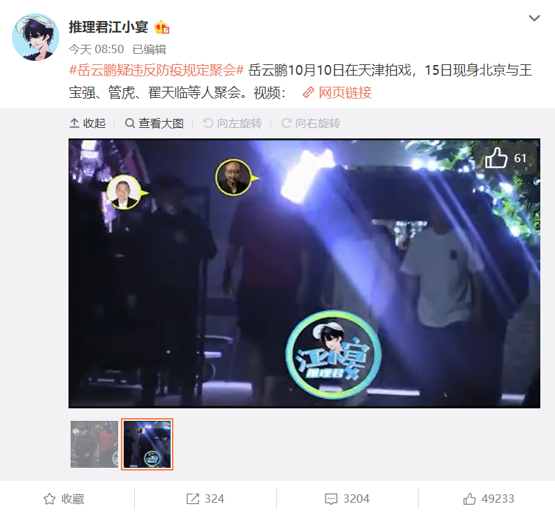 据另一位博主爆料,岳云鹏在10月10日,在天津拍戏,10月15日就现身北京和王宝强等人聚会,他的行为,违反了相关规定...
