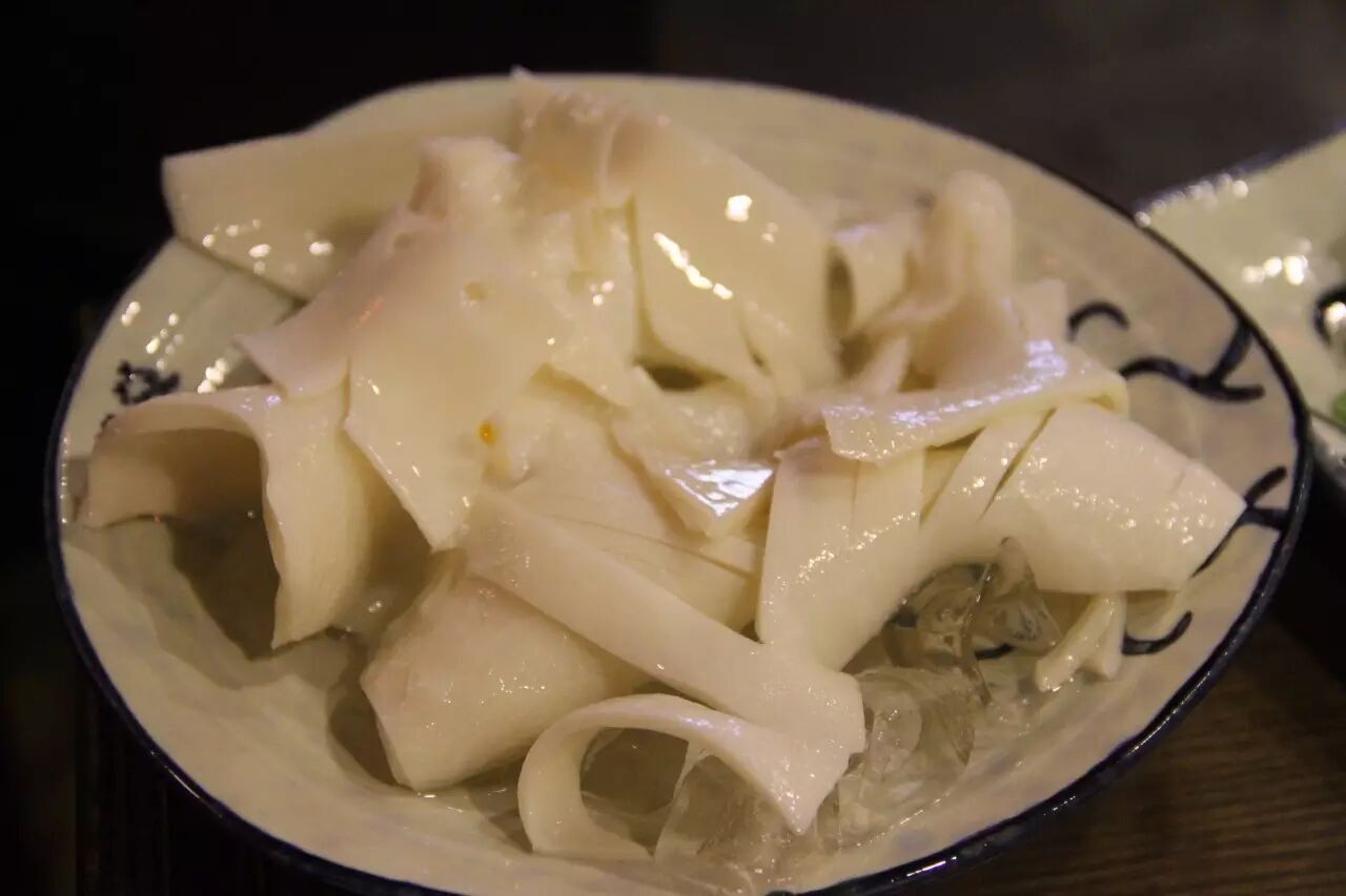 通威鱼皮。满满的胶原蛋白,喜欢口感爽脆的,建议烫几下,稍微变卷就可以开吃了。如果你喜欢吃嫩滑的话,强烈建议你用漏勺装好再煮,否则很有可能滑到你夹不起来。