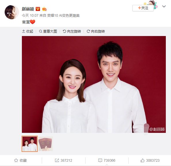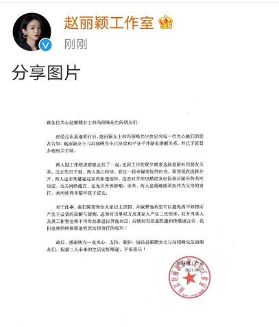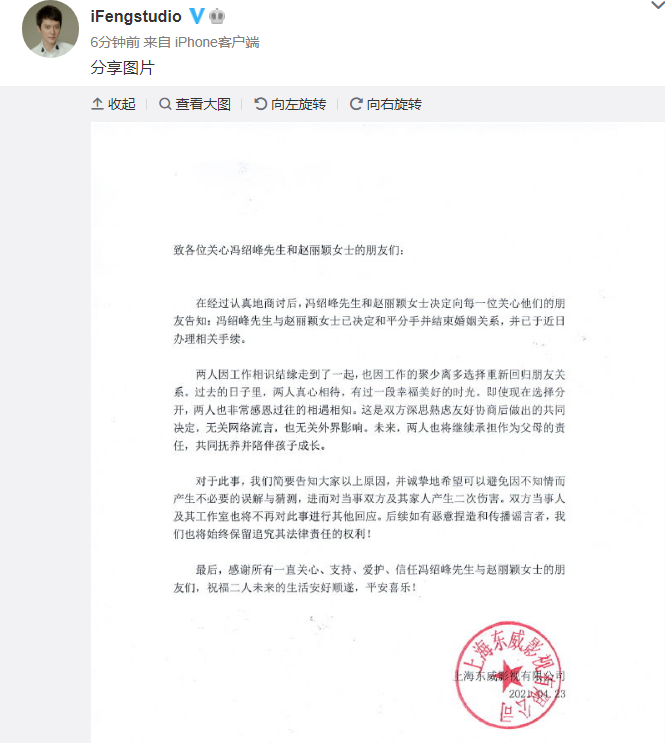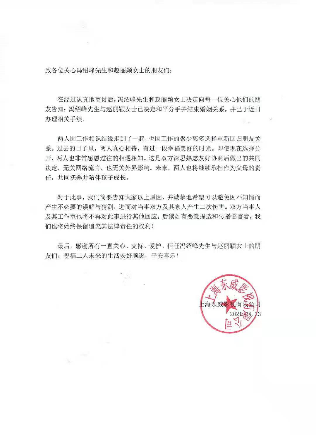 23日,@赵丽颖工作室 @iFengstudio 同时发布声明,称赵丽颖冯绍峰已决定和平分手结束婚姻关系,并已于近日办理相关手续,未来将共同抚养陪伴孩子成长。2018年10月16日,冯绍峰赵丽颖晒出结婚证官宣结婚;2019年3月8日,冯绍峰发文宣布妻子赵丽颖产下一子。