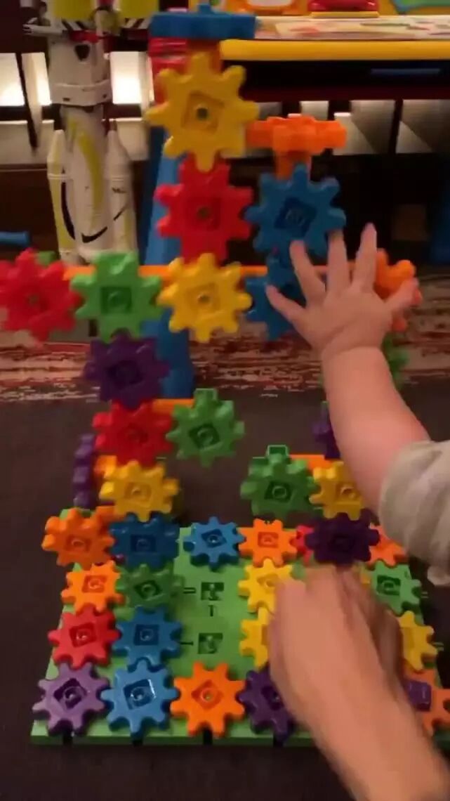 至1月17日,谢婷婷在社交网突然分享带娃日常,只见她用手遥控着玩具齿轮旋转,之后一只肉嘟嘟的小手出镜,十分灵活低拍打齿轮。