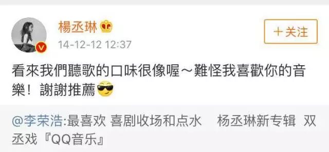 两人惺惺相惜,微博互动也是格外频繁。李荣浩在微博上推荐了杨丞琳的专辑杨丞琳随即回复:“看来我们听歌的口味很像哦难怪我喜欢你的音乐!谢谢推荐。”