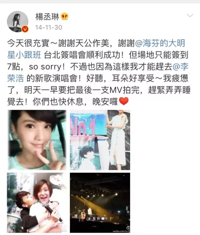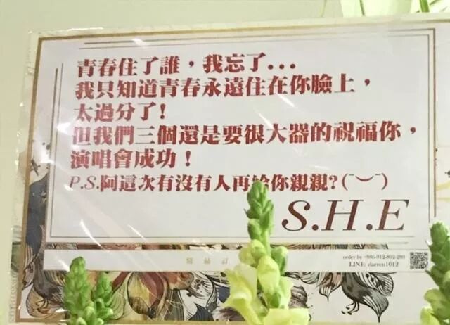 也难怪S.H.E在杨丞琳演唱会送的花篮写着“P.S.啊这次有没有人再给你亲亲?”让人不禁联想到李荣浩演唱会上出现的经典画面。