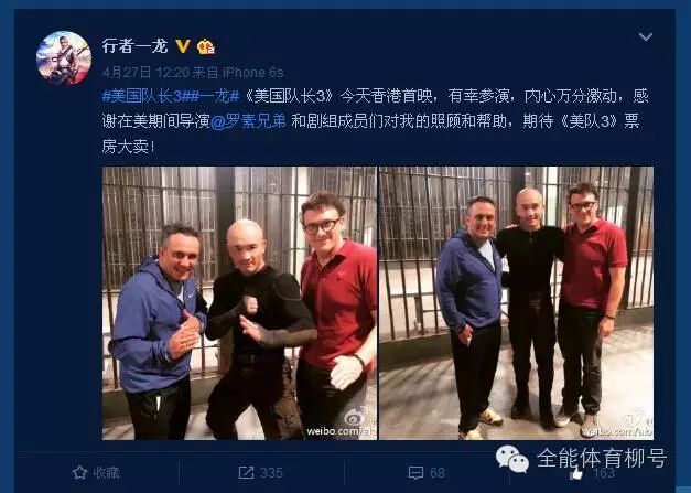4月27日,他在微博中说,“《美国队长3》今天香港首映,有幸参演,内心万分激动,感谢在美期间导演@罗素兄弟 和剧组成员们对我的照顾和帮助,期待《美队3》票房大卖!”