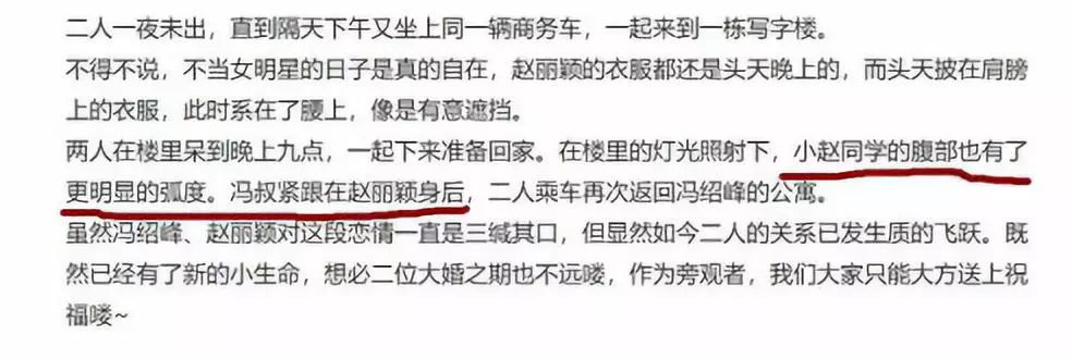 有爆料称,半停工状态的赵丽颖已经怀孕3个月,跟冯绍峰那段疑似真假的恋情基本上也算是实锤了,因为赵丽颖又被拍到深夜直奔冯绍峰公寓,且冯绍峰对赵丽颖照顾有加。爆料还指出赵丽颖走路的时候,有意用衣物遮挡腹部,且腹部有了明显的弧线?