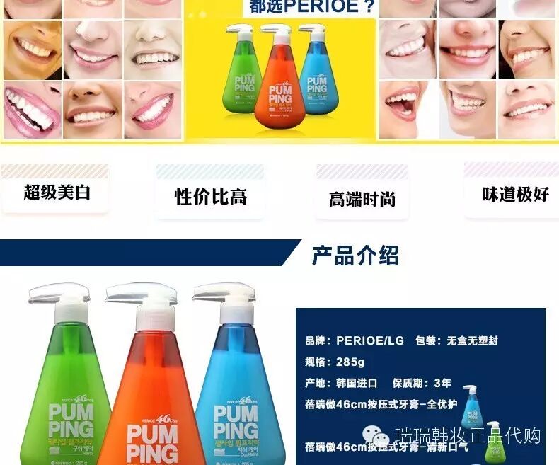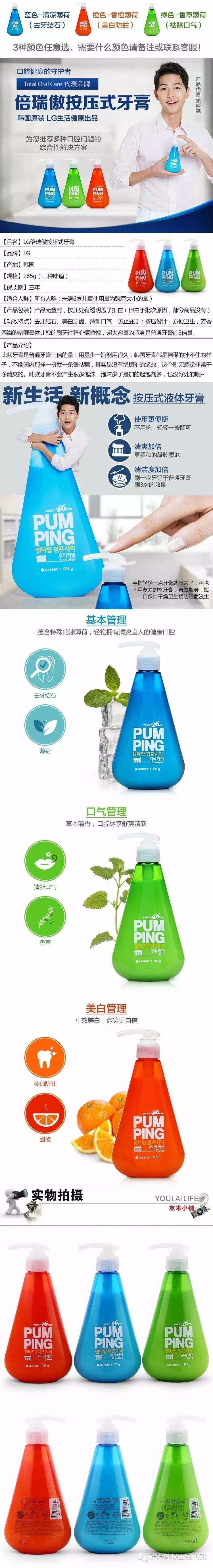 宋仲基代言 韩国进口LG倍瑞傲按压式液体牙膏 美白防蛀健齿去口气