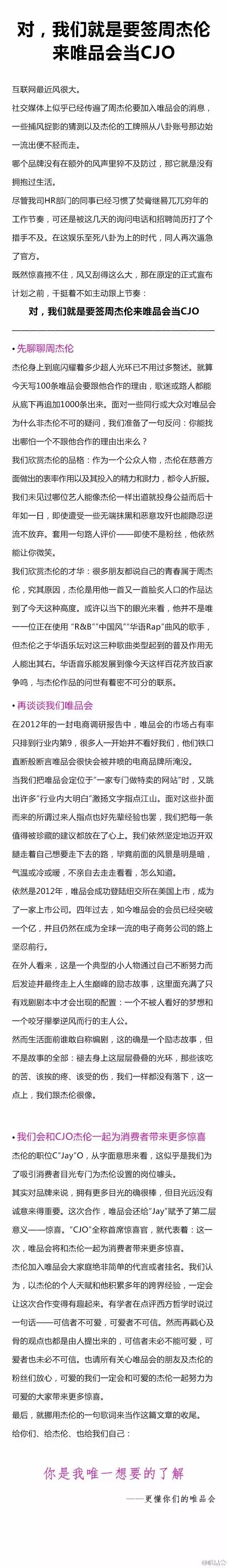 对,我们就是要签周杰伦来当 CJO 港台男星 2016-03-19 18:20:45 59 创作不易,用心坚持,欢迎请BaGua喝几杯爱心咖啡!打赏并支持本文 打赏并删除本文 昨天,唯品会官方微博公布签约周杰伦担任首席惊喜官,网友纷纷表示「很惊喜」「路转粉」「马上下载唯品会app」「想跟杰伦做同事」。到底是一篇怎样的声明,让粉丝,消费者和业界如此关注和喜爱?你们来感受一下。 创作不易,用心坚持,欢迎请BaGua喝几杯爱心咖啡!打赏并支持本文 打赏并删除本文 感谢您的支持鼓励,我会继续努力的!文章地址:用户邮箱:打赏金额:USDT 请输入数字点击”去打赏“,即可进行打赏支持本文章哦 周杰伦 发表评论