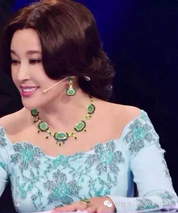 晶莹剔透,毫无疑问高白冰起荧光翡翠项链、耳环,仅项链就至少价值百万,雅典大方又不失贵气。