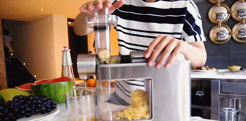 ▼把水果放进榨汁机,轻轻一按,果汁就出来了