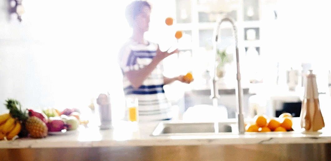▼新鲜橙汁是他的最爱,在厨房里居家的暖男形象也抵不过耍宝的本性