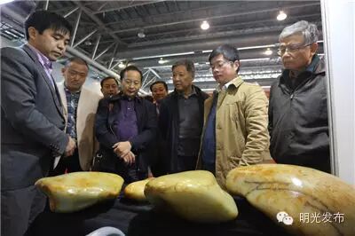 省、市经信委等有关领导听取高修(左)介绍玉雕工艺