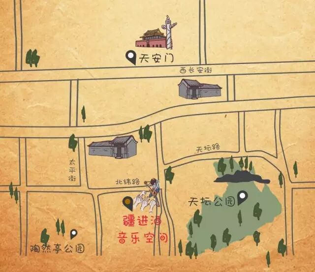 新的疆进酒在的位置很便利。二环内前门以南1.8公里处,北京中轴线的西侧。对面是天坛公园,北边是德云社,南边是先农坛体育馆。