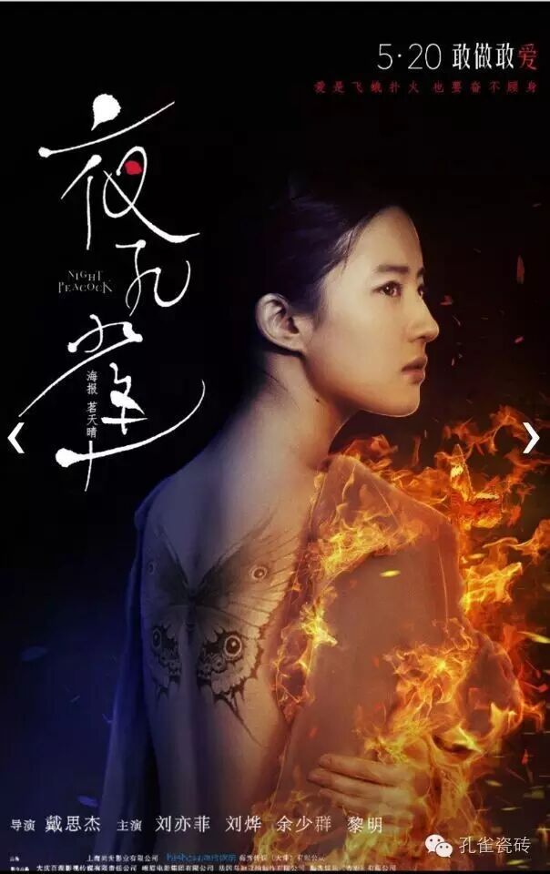 《夜孔雀》讲述了刘亦菲饰演的法籍华裔女孩艾尔莎与三个中国男人间的情感故事。身为长笛手的艾尔莎先在成都爱上了丝绸研究员、尺八高手马荣(黎明饰),与其儿子马林(余少群饰)有情感纠葛,后又在巴黎与纹身师建民(刘烨饰)之间产生情感。建民将“夜孔雀”蝴蝶纹在了艾尔莎的身上。这种神秘的“夜孔雀”被誉为世界上最美的蝴蝶。但它从破茧开始只能存活三天。