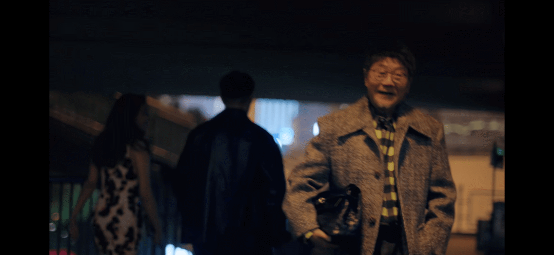 场景变换中,咱们的范大爷烫着小卷发,身穿黑黄格纹衬衫、烟灰色大衣,腋下夹着品牌手袋,出现在漫天烟花的场景下。