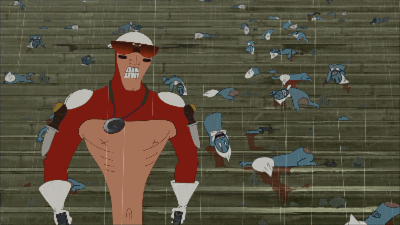 整部片子cult风十足,到处充斥着血浆、情色、粗口和各种奇葩的设定,猎奇的观众绝对可以大饱眼福。但它绝不是纯粹的低俗恶搞,《阿阿奇与西西帕克》的制作相当精良,动画里猎捕蓝色小人的正义执行官基克,每次出场都酷到爆啊!