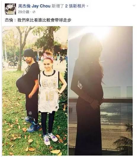昆凌,六个月的时候穿着宽松篮球服,还没有旁边的准爸爸周杰伦胖。