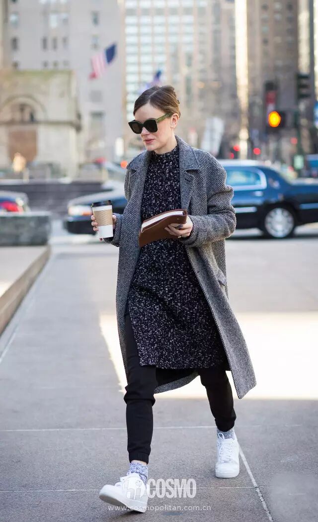 Jo Ellison穿衣品味绝对是我们效仿的最佳选择,裤装+中长款开衩毛衣+简约白色运动鞋随性舒适,而在寒冷冬日来一件长款大衣外套保暖足矣。