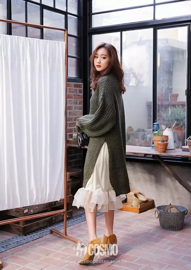 别以为超长款的开衩毛衣只可以内搭牛仔裤或leggings,其实搭配这种公主风满满的裙子也很美,在毛衣衣摆处露出荷叶边充满暖暖的少女情怀。