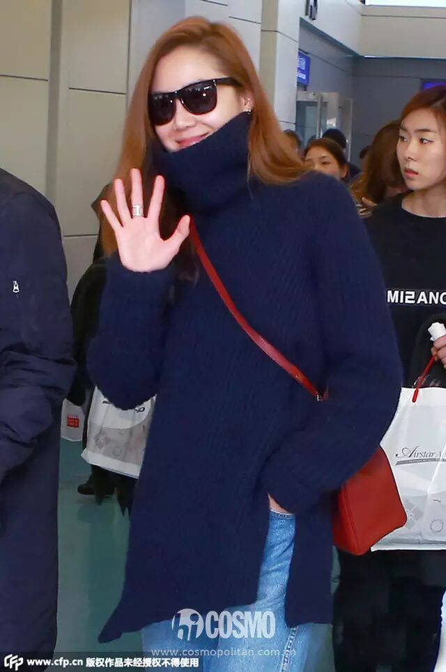 韩国人气一线女星孔孝真身穿深蓝色高领开衩毛衣+红色迷你包+牛仔裤+Converse黑色帆布鞋现身机场,简约随性又保暖。