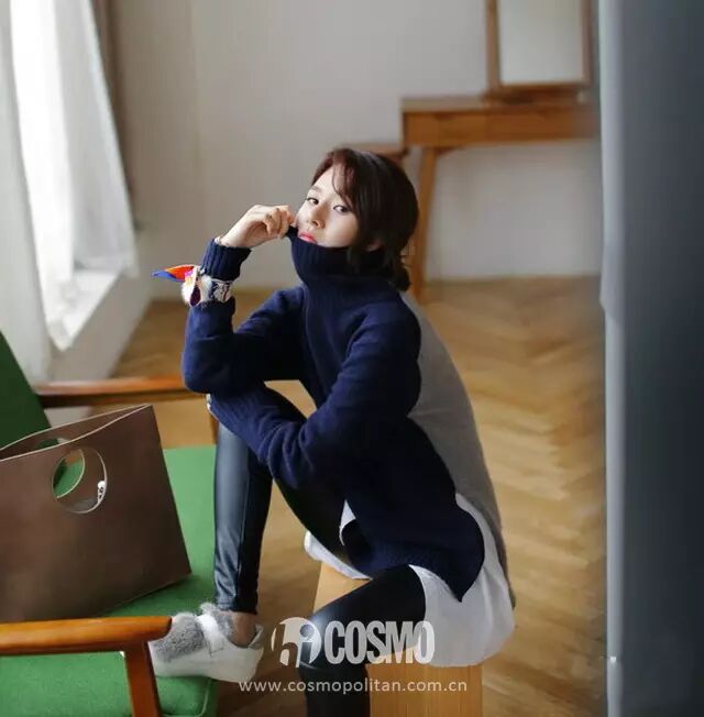 开衩毛衣你可以随时随地找到,但像这种高领酷酷的前后拼接色款式可不是随便都能找到哦~这种简约且偏中性的好物+hot皮裤再配上现今很流行的小白鞋简直美爆了!