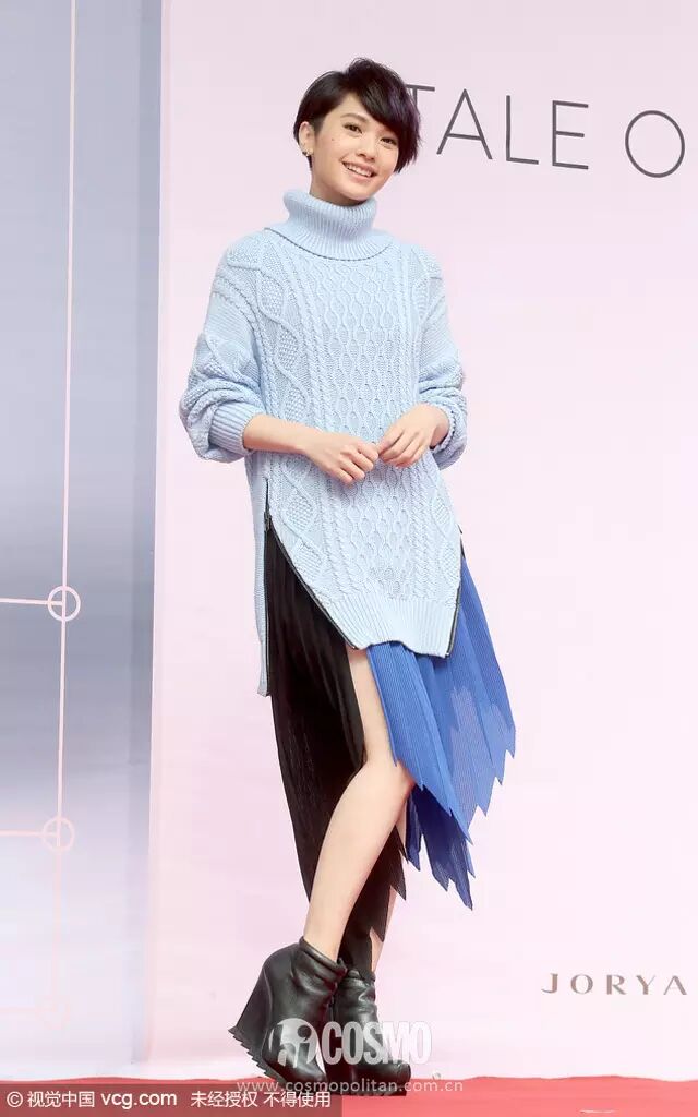 高领毛衣可谓是秋冬保暖有型的最佳选择~杨丞琳身穿蓝色高领开衩毛衣+不规则拼色半身裙+黑色坡跟高跟短靴,露出性感美腿给这个冬日增添了一道风景线哦~