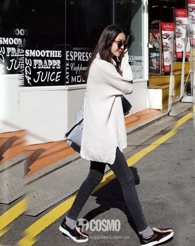 个人还是提倡毛衣搭配紧身裤、铅笔裤的穿搭法则,这不随性而安的开衩毛衣下配修身白色牛仔裤保暖同时拉长腿部曲线。