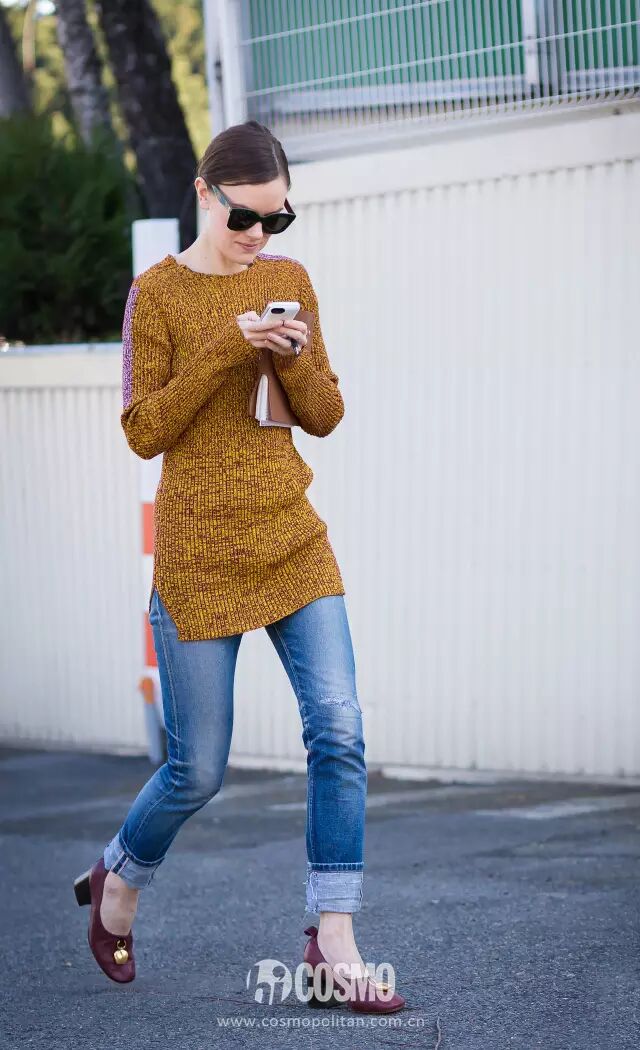 宽松款式的开衩毛衣绝对是你办公室扮靓的绝佳利器,搭配上修身牛仔裤+懒人滑板鞋当别人在冬日肿成熊的时候,你却轻盈似闪电的视感就足够美!