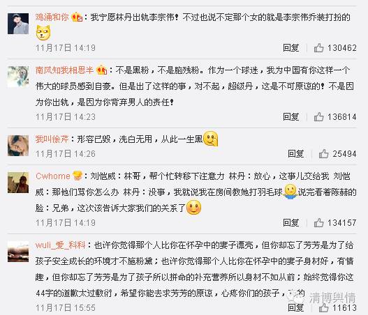 林丹出轨一事,截至11月25日下午15时,共收获了91万条评论,其中多为对其进行辱骂、谴责的言论。其中微博网民@南风知我相思半 痛心表示,“作为一个球迷,我为中国有你这样一个伟大的球员感到自豪。但是出了这样的事,对不起,超级丹,这是不可原谅的!不是因为你出轨,是因为你背弃男人的责任!”