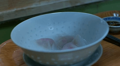 高筋面粉要用女人的手一直揉,揉得像剥了壳的鸡蛋一样。揉好的面团,搓成条,擀成皮。包上调制好的肉馅。高汤煮熟,撒上一些香葱粒,一碗原汁原味的饺子就端上桌咯!