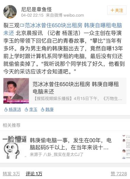 4月2日晚,一则去年4月的搜狐娱乐新闻被微博网友“尼尼是章鱼怪”扒出,视频主要内容是导演李玉在带着范冰冰、韩庚宣传电影《万物生长》时,谈到了各自青春期的故事,男主角韩庚就开始自曝:自己青春时期特别坏。他在采访中说,曾在13年前租借了同学的电脑,同学没记得找他要,他就偷偷地将电脑卖掉了。
