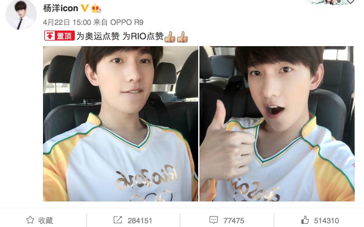 北京时间2016年4月22日,里约奥运会圣火传递仪式在雅典举行,杨洋作为中国明星火炬手出现在现场。他的阳光、青春、活力、积极,完美的诠释了所有美好!