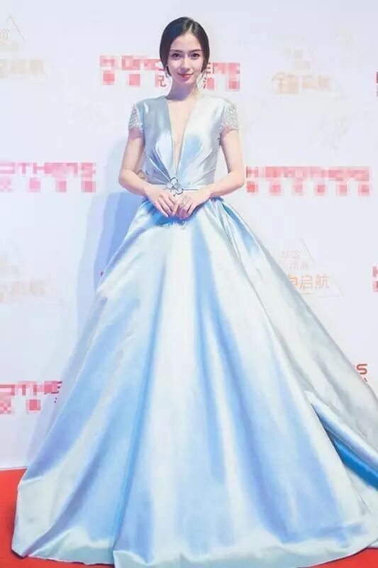赵薇蓝色的抹胸连衣裙,这裙子的纱质和整体设计看起来像是某宝网的感觉。