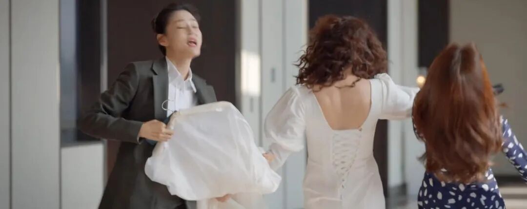 走廊上,殷桃、闺蜜与前夫的新娘擦身而过;强调一下,此时的新娘是举着婚纱还没来得及换,为什么不换,因为要方便闺蜜一脚踩中婚纱,好让三人一起滑倒。