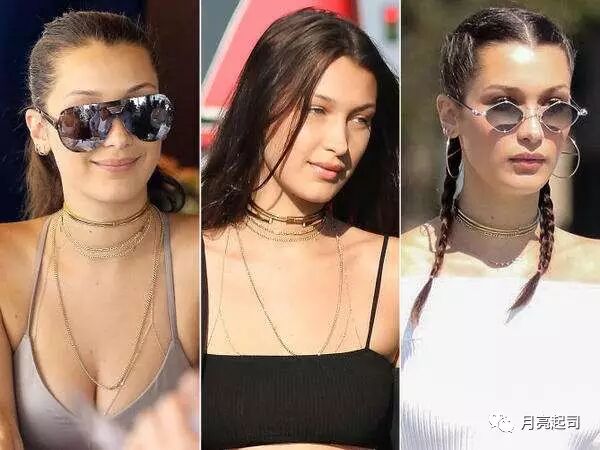 超模Bella也是choker的狂热爱好者,长的细的,单条,多层的choker也被她驾驭的游刃有余,也是她日常街拍的好配饰。