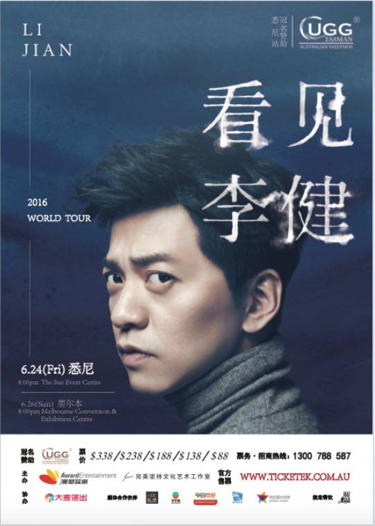 由澳华娱乐国际公司主办,【看见李健】2016世界巡回演唱会(澳洲站)将於悉尼The Star Event Centre(6月24日)和墨尔本Convention and Exhibition Centre(6月26日)举行!悉尼站更得到UGG (Tasman) 冠名赞助。