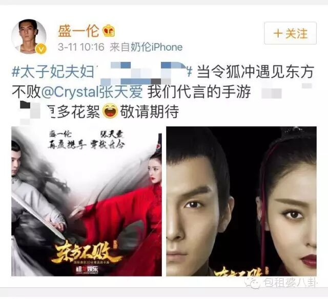 先前两人合体代言同款手游,手游公司的官方tag是太子太子妃两人,盛一伦与手游公司保持一致。