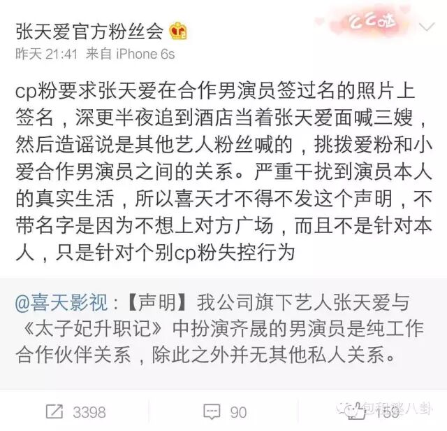 张天爱方给出的理由是最近CP粉嚣张,甚至打扰到她的正常工作生活,于是公司迫不得已强行拆CP。