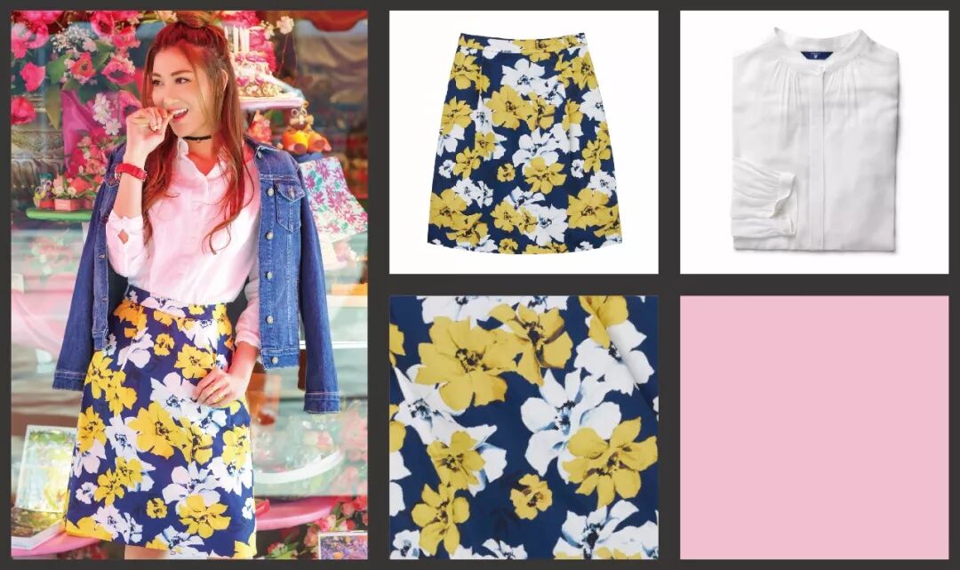 香港影、视、歌三栖明星李彩桦白色衬衫、牛仔夹克搭配GANT蓝底朱瑾花短裙呼应出一种独特的女性魅力。