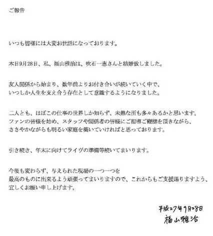 据日本媒体刚刚报道,歌手福山雅治和女演员吹石一惠于28日宣布结婚。今天也是吹石一惠的33岁生日,而他们的结婚也就成为所谓的“生日婚”。双方事务所都公开了经两人直属签名的传真副本。シンガーソングライターの福山雅治(46)が女優・吹石一恵(33)と入籍したことを28日、発表した。この日が吹石の33歳の誕生日。バースデー婚となった。双方の所属事務所が本人たちの直筆署名入りファクスでそれぞれ発表した。
