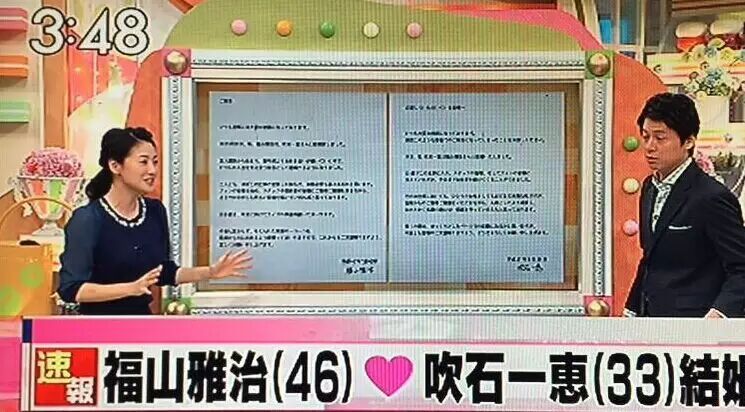 吹石也公开说:“吹石一惠与福山雅治结婚了。”吹石13岁入演艺圈,如今已是第20年。吹石も「本日、吹石一恵は福山雅治さんと結婚いたしました」と報告した。吹石は13歳で芸能界入りしており、芸能生活20年の節目の年となる。