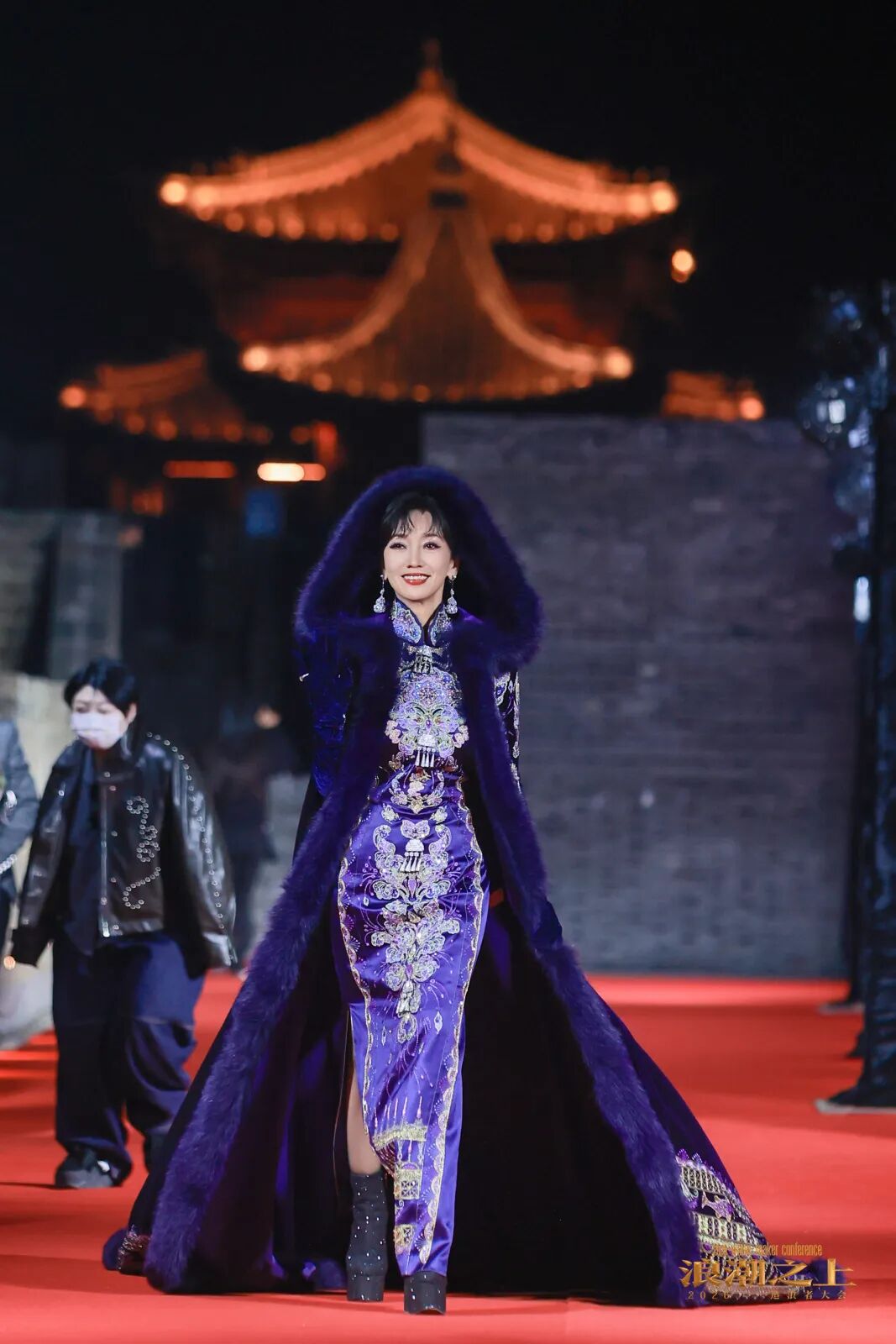 赵雅芝一袭中式礼服惊艳亮相,与盐官古城-潮乐之城的古建筑相映成趣。
