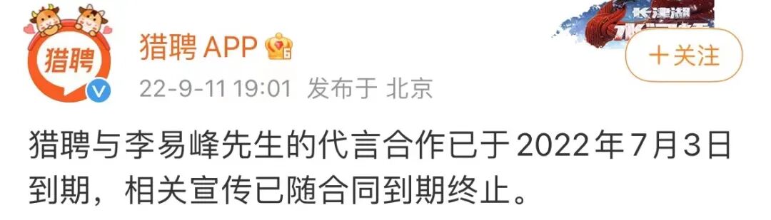 猎聘APP通过官博表示,其与李易峰的代言合作已于2022年7月3日到期,相关宣传已随合同到期终止。