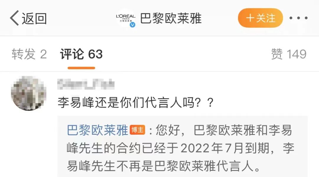 巴黎欧莱雅也在其官博评论区回复表示,其与李易峰的合约已于2022年7月到期,李易峰不再是该品牌代言人。