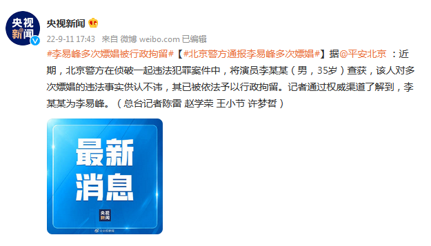北京警方通报演员李某某多次嫖娼被行拘,据人民日报等媒体报道,演员李某某为@李易峰 。
