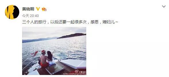 黄晓明在微博中公开angelababy怀孕喜讯,并写道:“三个人的旅行,以后还要一起很多次,感恩,媳妇儿~ ”