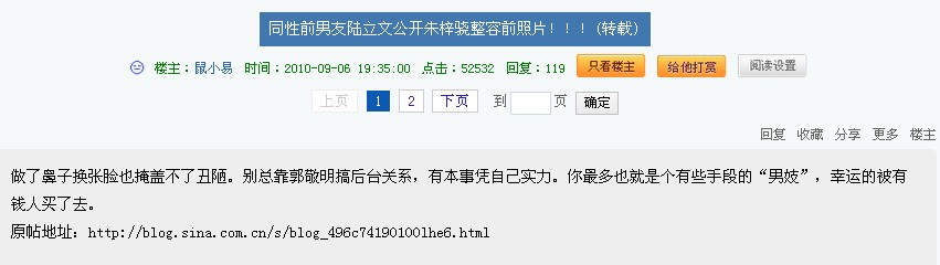 2010年9月,疑似小朱前男友(陆立文)在网上爆尿,本来跟小朱很好一对,但被小四横刀夺爱。