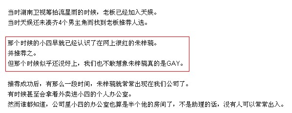事情是这样开始的,2010年4月份。一个疑似是小四公司员工在网上爆料,称老板跟朱梓骁感情不一般。