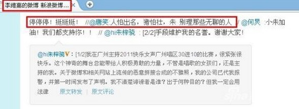 小朱当时正在广州主持快女,给了一个回应称被恶意诽谤,一帮朋友(主要是芒果台那些)在网上声援,但是作用不大。