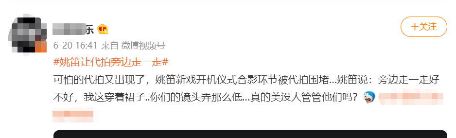 现场,姚笛不停的在挥手,试图让代拍走开,语气十分的无奈。