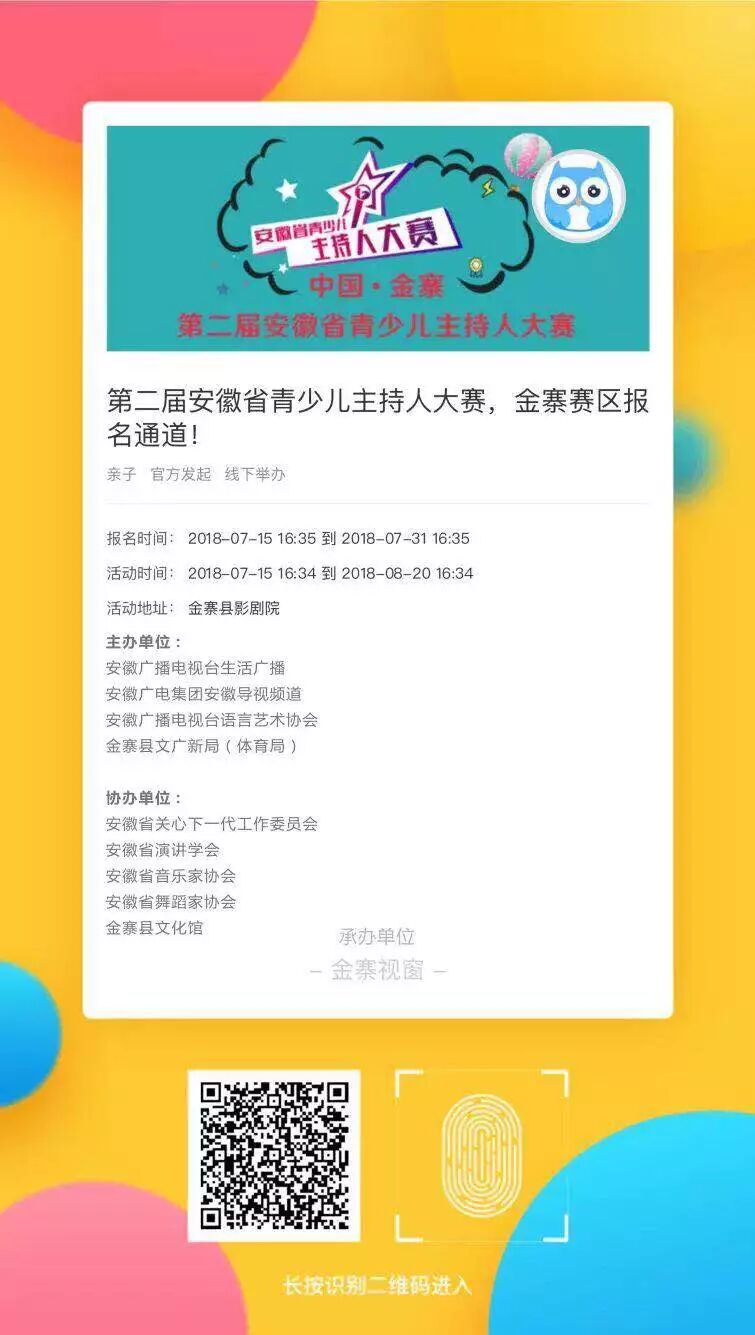第二届安徽省青少儿主持人大赛金寨赛区,由金寨县文广新局主办,面向全县青少年。该活动是全省大型少儿主持、口才、语言表演行业年度顶级赛事。